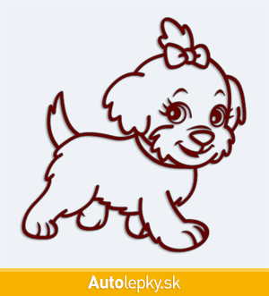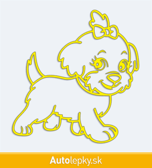 Nálepku malý psík na auto vyrábame v 40 farbách a mnohých veľkostiach. Minimálny rozmer samolepky je 9.6×10 cm, katalógové číslo 5667. Nálepka malý psík na auto je vyrobená z kvalitnej samolepiacej fólie s životnosťou 3-5 rokov.