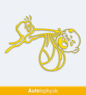 Samolepku dieťa v aute bocian nesie batoľa môžete doplniť menom dieťaťa alebo krátkym ľubovoľným textom. Minimálny rozmer samolepky je 15×11.2 cm, katalógové číslo 3612. Nálepka na auto bocian nesie batoľa upozorňuje na prepravované dieťa v aute.