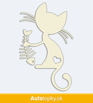 Nálepku mačka s kosťou ryby na auto vyrábame v 40 farbách a mnohých veľkostiach. Minimálny rozmer samolepky je 6.1×10 cm, katalógové číslo 2529. Nálepka na auto mačka s kosťou ryby je vyrobená z kvalitnej samolepiacej fólie s životnosťou 3-5 rokov.