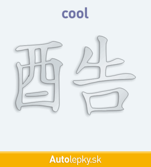 Nálepku čínsky znak Cool na auto vyrábame v 40 farbách a mnohých veľkostiach. Minimálny rozmer samolepky je 10×6.6 cm, katalógové číslo 3239. Nálepka na auto s čínskym znakom Cool je vyrobená z kvalitnej samolepiacej fólie s životnosťou 3-5 rokov.