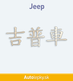 Nálepku čínsky znak Jeep na auto vyrábame v 40 farbách a mnohých veľkostiach. Minimálny rozmer samolepky je 10×3.3 cm, katalógové číslo 5318. Nálepka na auto s čínskym znakom Jeep je vyrobená z kvalitnej samolepiacej fólie s životnosťou 3-5 rokov.