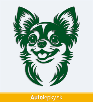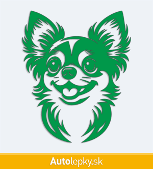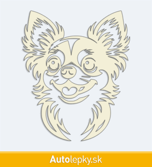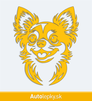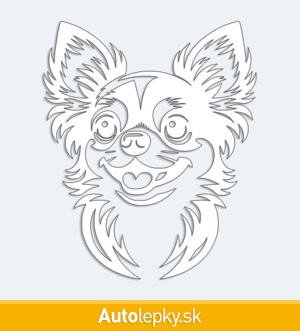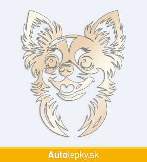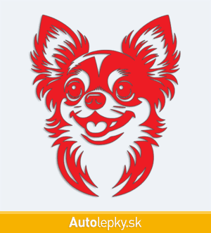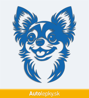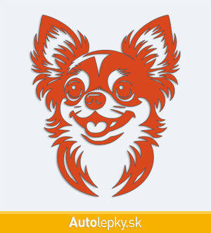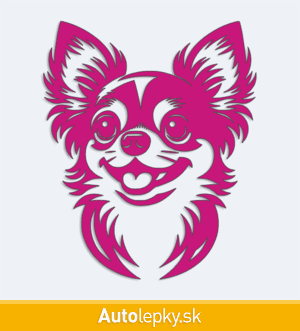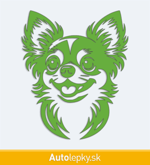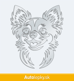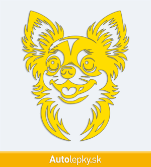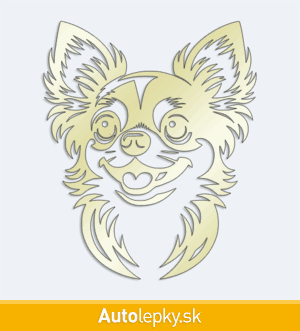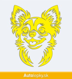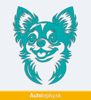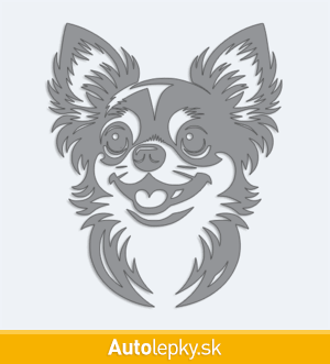 Nálepku hlava čivavy na auto vyrábame v 40 farbách a mnohých veľkostiach. Minimálny rozmer samolepky je 8.3×10 cm, katalógové číslo 6262. Nálepka na auto s hlavou čivavy je vyrobená z kvalitnej samolepiacej fólie s životnosťou 3-5 rokov.
