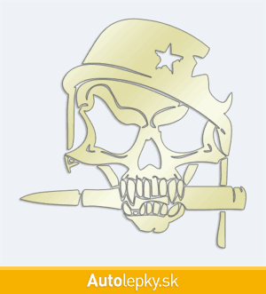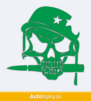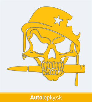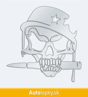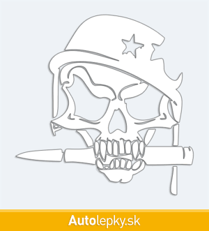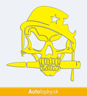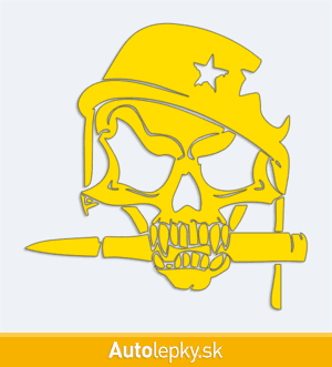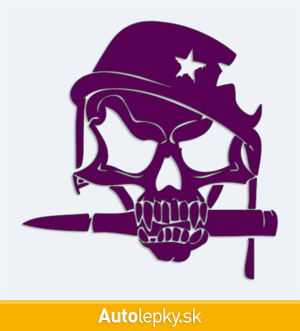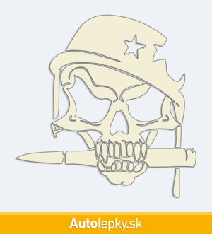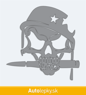 Nálepku lebka vojaka na auto vyrábame v 40 farbách a mnohých veľkostiach. Minimálny rozmer samolepky je 12.8×13 cm, katalógové číslo 6229. Nálepka na auto s lebkou vojaka je vyrobená z kvalitnej samolepiacej fólie s životnosťou 3-5 rokov.