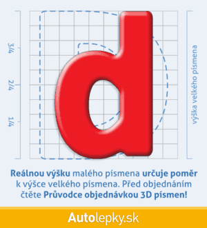 3D nálepku s plastickým povrchom, písmeno d, nalepíte aj na mierne prehnuté povrchy. Pomocou písmen a číslic môžete na aute vytvárať 3D plastické nápisy. Plastická 3D nálepka - malé písmeno D, katalógové číslo 8262, vyberajte vždy podľa rozmerové kategórie.