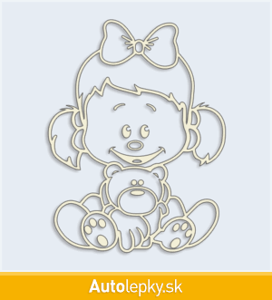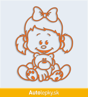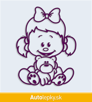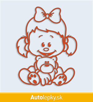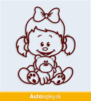 Samolepku dieťa v aute dievča s medvedíkom môžete doplniť menom dieťaťa alebo krátkym ľubovoľným textom. Minimálny rozmer samolepky je 7.6×10 cm, katalógové číslo 4765. Polep dieťa v aute dievča s medvedíkom upozorňuje na prepravované dieťa v aute.