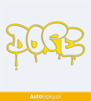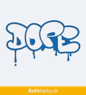 Nálepku nápis DOPE na auto vyrábame v 40 farbách a mnohých veľkostiach. Minimálny rozmer samolepky je 10×6.2 cm, katalógové číslo 1728. Samolepka s nápisom DOPE na auto je vyrobená z kvalitnej samolepiacej fólie s životnosťou 3-5 rokov.